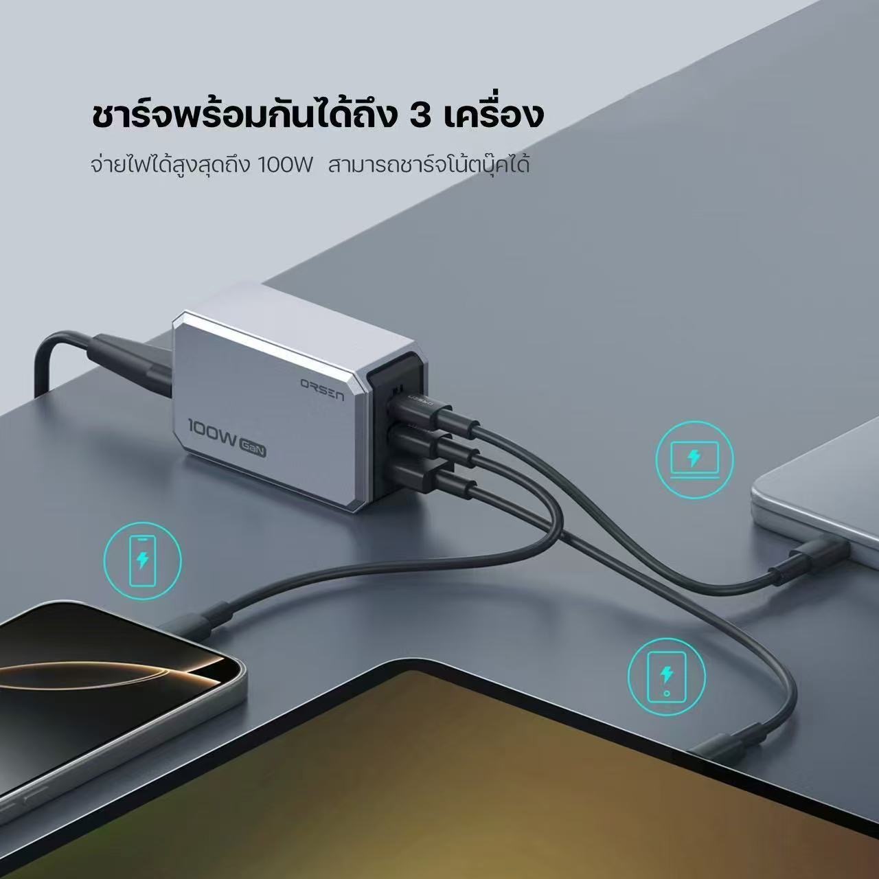 ・ Orsen by Eloop C102T หัวชาร์จเร็ว GaN 3 พอร์ต รองรับการชาร์จเร็วสูงสุดถึง 100W Max
